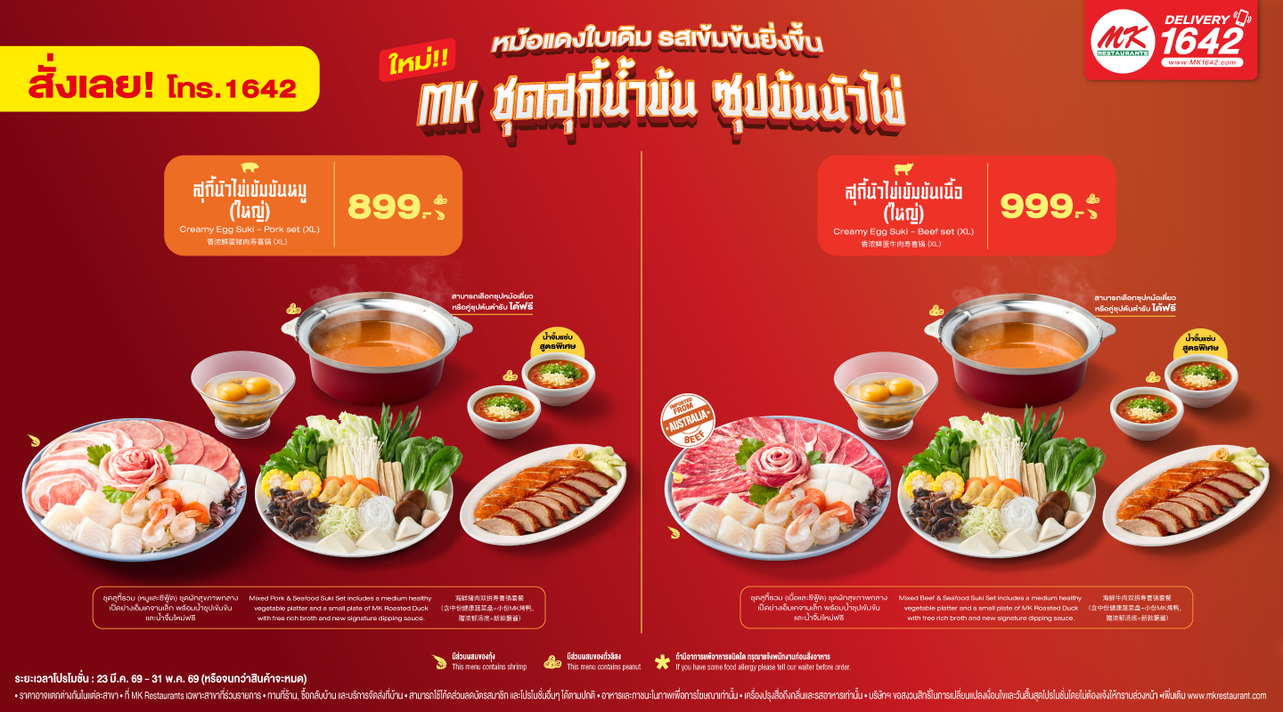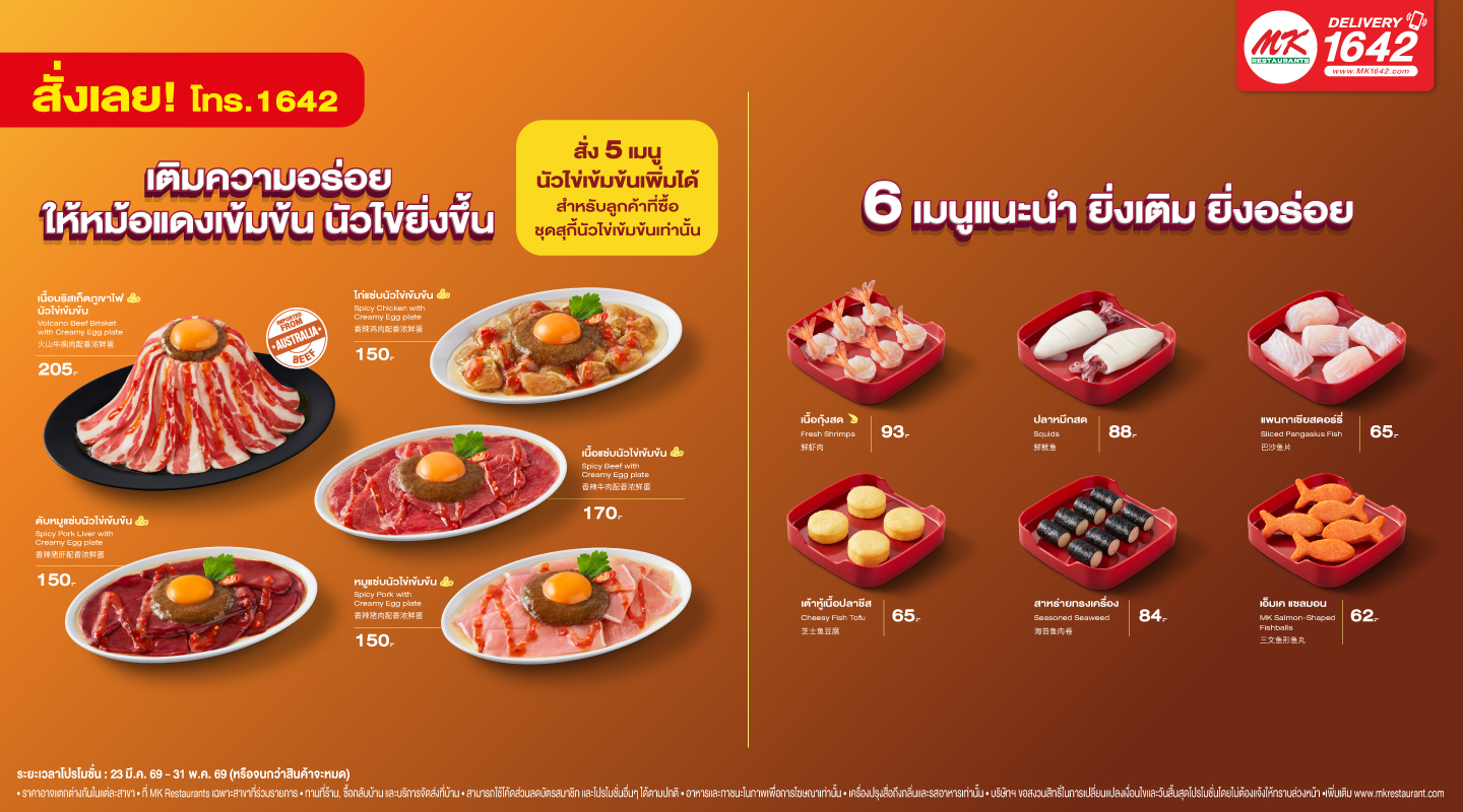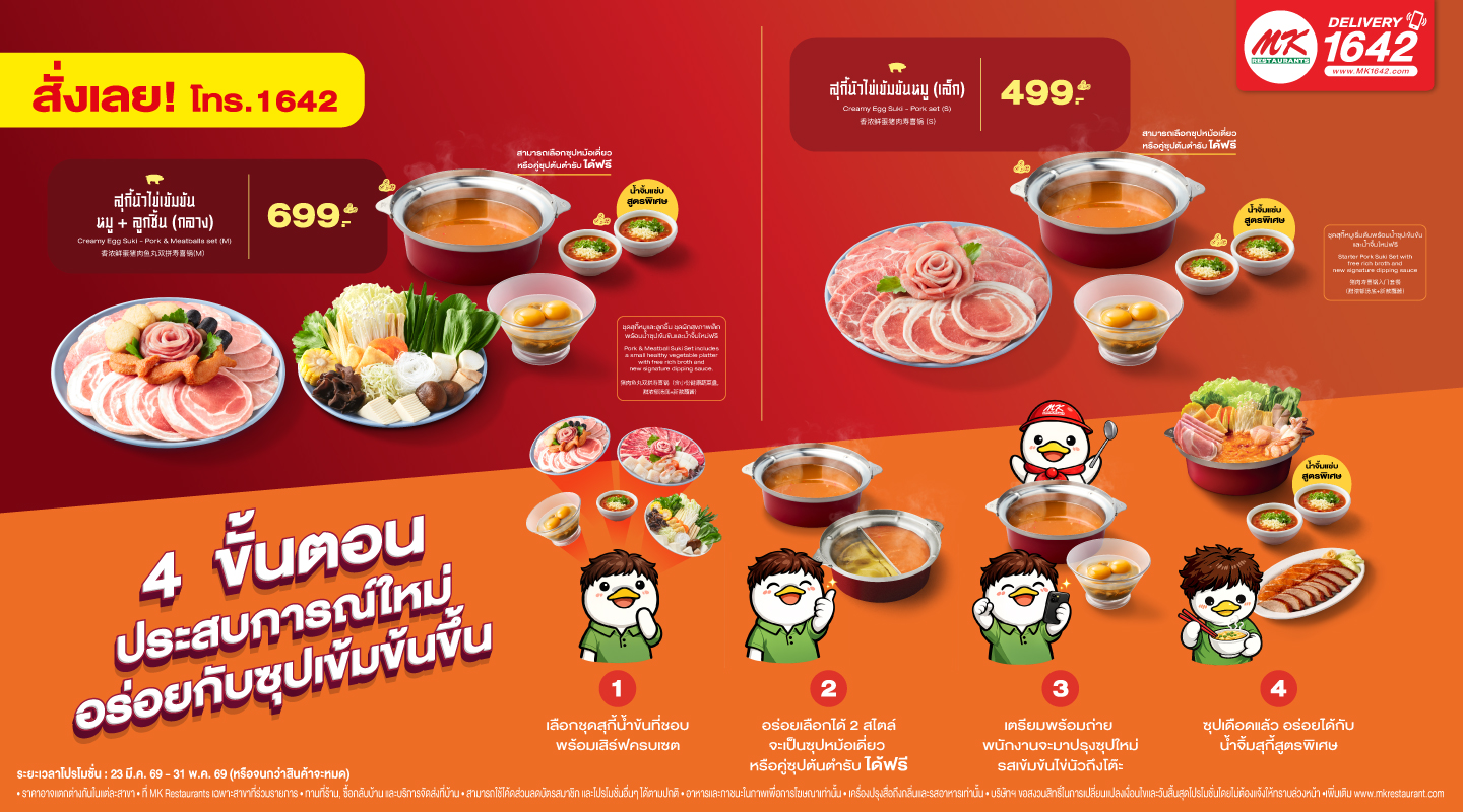 ระยะเวลา 23 มีนาคม 2569 – 31 พฤษภาคม 2569 (หรือจนกว่าสินค้าจะหมด) ที่ MK Restaurants เฉพาะสาขาที่ร่วมรายการ ตรวจเช็คสาขาที่เข้าร่วมรายการ โทร. 1642