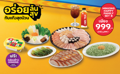 Minions Happy Family Set B ราคา 999 บาท (จากปกติ 1,119 บาท) สินค้ามีจำนวนจำกัดในแต่ละสาขา เมนูในเซต : ชุดสุขล้นวาไรตี้ เป็ดย่าง+หมูแดง (เล็ก) บะหมี่หยก (ใหญ่) ฮ่องเต้น้อยน้ำมันหอย (เล็ก) ชามะนาว น้ำชา MK Minion Pinto เงื่อนไขการใช้สิทธิ์ : ระยะเวลาโปรโมชั่น และการใช้สิทธิ์วันที่ 1 ตุลาคม 2568 – 21 ตุลาคม 2568 ใช้ได้เฉพาะช่องทางโฮมเดลิเวอรี่: เว็บไซต์ www.MK1642.com, Call Center 1642 (Delivery และ Online Self Pick-up) ไม่สามารถใช้ร่วมกับบัตรสมาชิก หรือส่วนลดอื่นๆได้ ไม่สามารถแลก เปลี่ยน โอน หรือทอนเป็นเงินสดได้ บริษัทขอสงวนสิทธิ์ในการเปลี่ยนแปลงเงื่อนไขโดยไม่ต้องแจ้งให้ทราบล่วงหน้า