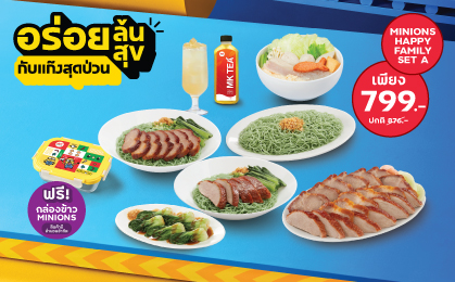 Minions Happy Family Set A ราคา 799 บาท (จากปกติ 876 บาท) สินค้ามีจำนวนจำกัดในแต่ละสาขา เมนูในเซต : บะหมี่หยกเป็ดย่าง (แห้ง) สุกี้รวมมิตร น้ำ บะหมี่หยกหมูแดงแห้ง ฮ่องเต้น้อยน้ำมันหอยจานใหญ่ เป็ดย่าง+หมูแดง (เล็ก) บะหมี่หยก (ใหญ่) น้ำผึ้งมะนาว เลมอนเจลลี่ น้ำชา MK Minion Pinto เงื่อนไขการใช้สิทธิ์ : ระยะเวลาโปรโมชั่น และการใช้สิทธิ์วันที่ 1 ตุลาคม 2568 – 21 ตุลาคม 2568 ใช้ได้เฉพาะช่องทางโฮมเดลิเวอรี่: เว็บไซต์ www.MK1642.com, Call Center 1642 (Delivery และ Online Self Pick-up) ไม่สามารถใช้ร่วมกับบัตรสมาชิก หรือส่วนลดอื่นๆได้ ไม่สามารถแลก เปลี่ยน โอน หรือทอนเป็นเงินสดได้ บริษัทขอสงวนสิทธิ์ในการเปลี่ยนแปลงเงื่อนไขโดยไม่ต้องแจ้งให้ทราบล่วงหน้า